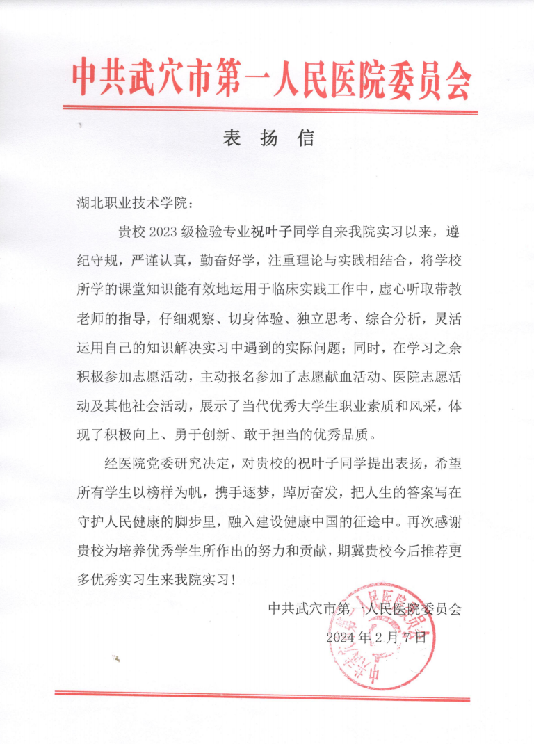 2024年2月8日,我校实习合作单位武穴市第一人民医院发来喜讯,yl23455永利集团2021级医学检验技术2班学生祝叶子在实习期间,责任心强、工作态度认真、积极进取、专业技能扎实,赢得领导、科室老师的一致好评,经医院党委研究决定,特向该生提出表扬。