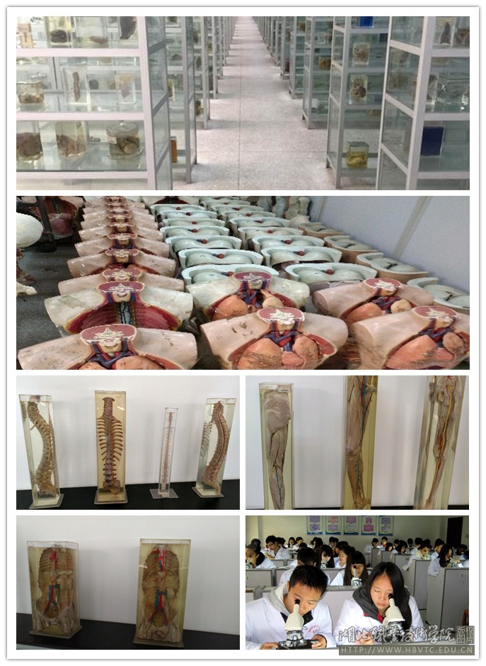 (二)多媒体解剖实验室6个,每个实验室均有多媒体教学设备。实验室两侧陈列有解剖、组织、胚胎模型1000余个,电动模型20个。