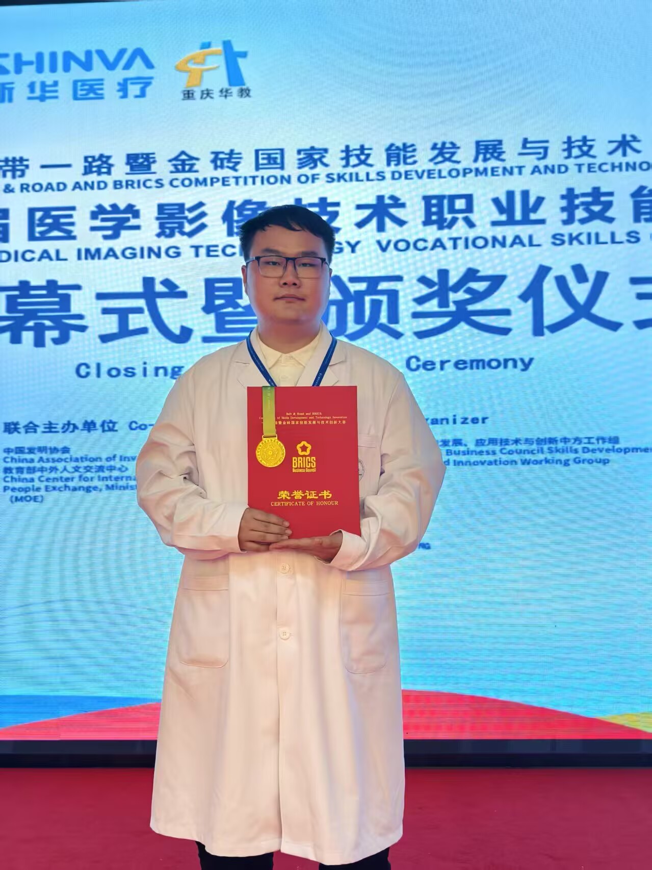 (本网讯 陈新祥 李洁)2025年10月23至26日,“2025一带一路暨金砖国家技能发展与技术创新大赛第一届医学影像技术职业技能赛项”在北京卫生职业技术学院隆重举行,共有61所学校、220多名选手参加了本次比赛。经过紧张激烈的角逐,yl23455永利集团医学影像技术竞赛团队CT赛道的颜宇航同学凭借精湛技能和扎实的理论基础脱颖而出,荣获金奖。