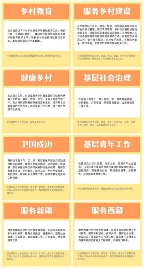 西部计划设置乡村教育、服务乡村建设健康乡村、基层社会治理卫国戍边、基层青年工作服务新疆、服务西藏8个专项。