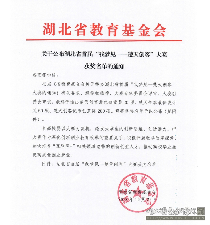 “我梦见——楚天创客”大赛由湖北省教育基金会主办,经学校预赛、推荐,大赛专家委员会评审,大赛组委会审核,最终评选出楚天创客最佳创意奖20项、楚天创客最佳设计奖60项、楚天创客优秀创意奖200项。