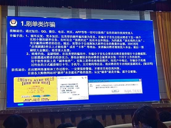 王诗明以近期发生在校园周边及网络上的典型诈骗案例为切入点,详细剖析了诈骗分子的常用手段。如用“轻松兼职、高额报酬”为诱饵吸引学生参与刷单,进而实施诈骗;冒充亲友类诈骗,盗取受害人的QQ、微信账号及密码,在受害人的QQ好友中群发消息,以各种理由借钱来实施诈骗;冒充客服退款类诈骗,称客户购买的商品有瑕疵、质检不过关、铅汞含量高等原因,商户可以多倍退赔款,诱导受害人点击退款专用“链接”实施诈骗等。