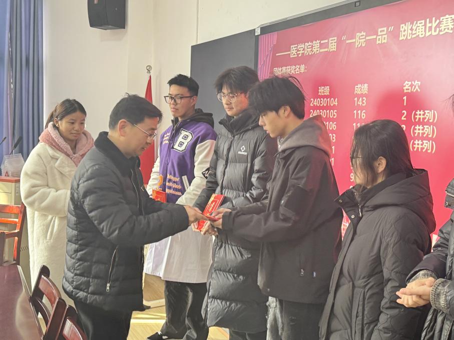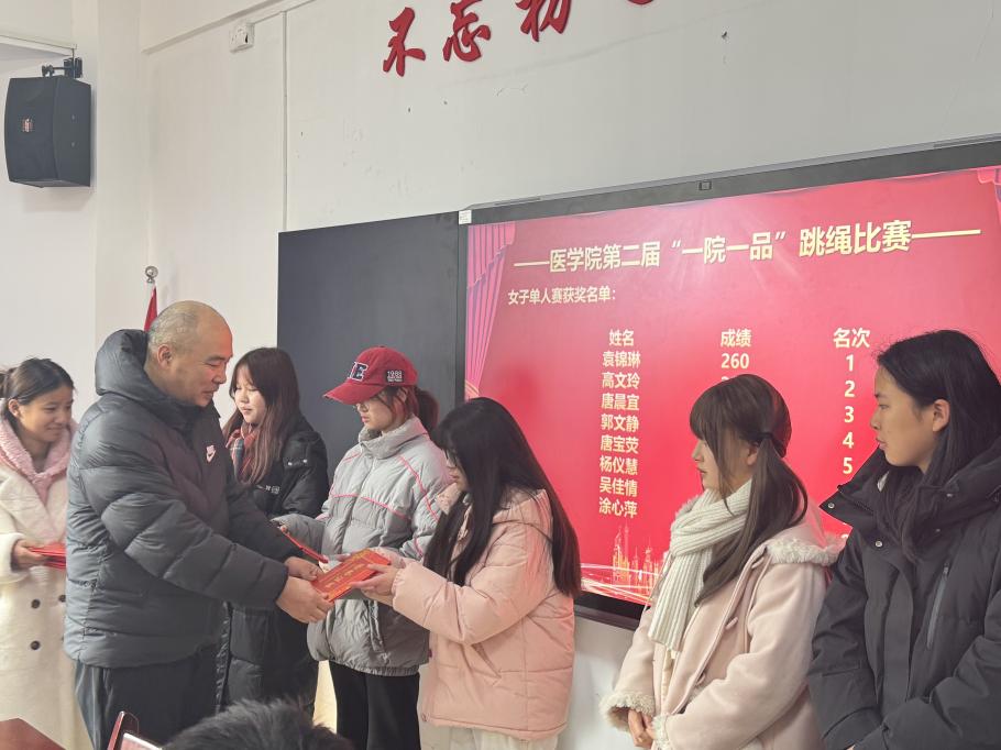 经过一系列紧张激烈的较量,女子单人跳绳比赛项目2024级药学专业袁锦琳、医学检验技术专业高文玲和医学影像技术唐晨宜分别荣获前三名,男子单人跳绳比赛前三名分别由2024级医学检验技术专业王倚天、药学专业王涵洋和医学检验技术专业胡向宇同学获得,2024级临床4班、临床5班和临床6班分别荣获前三名,yl23455永利集团副院长王光耀、学工办主任蔡国松与辅导员廖晓玲老师分别为获奖运动员颁发荣誉证书与奖品。