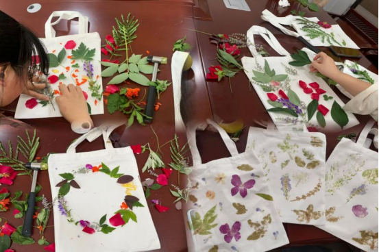 活动现场,同学们在专业老师的指导下,运用敲打、按压等手法,将药植园内薄荷、艾草、金银花等中草药的形态与纹理巧妙地拓印在帆布包上,创作出一件件精美的文创作品。与此同时,指导老师还适时讲解每种植物的形态特征及药用功效,使学子们在轻松愉悦的氛围中深化了对中医药文化的认知与理解。