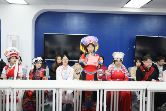 在“铸牢共同体 增强共同性 ”文化展示环节,满族、白族、纳西族、壮族、苗族、彝族等学生代表登台,通过PPT生动解说与特色展示,分享了各民族“美美与共、团结共融”的文化画卷,展现了多元文化的独特魅力。在交流发言环节,学生代表们踊跃发言,围绕学业进步、生活服务、文化互嵌等方面提出建议,与会老师现场逐一回应,为学生排忧解难,现场氛围热烈融洽。